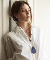 La ligne ENAMEL est un hommage à la matière et au métier d’art. Le médaillon du sautoir est émaillé selon la méthode traditionnelle d’émaillage utilisée depuis l’Antiquité. L’émail est un verre dont la composition s’apparente au cristal. Sous forme de poudre, il est appliqué sur du cuivre et cuit entre 750 et 1000 degrés. Les cuissons successives permettent d’obtenir la transparence. Chaque pièce produite a des nuances de couleur particulières qui en font une pièce unique.